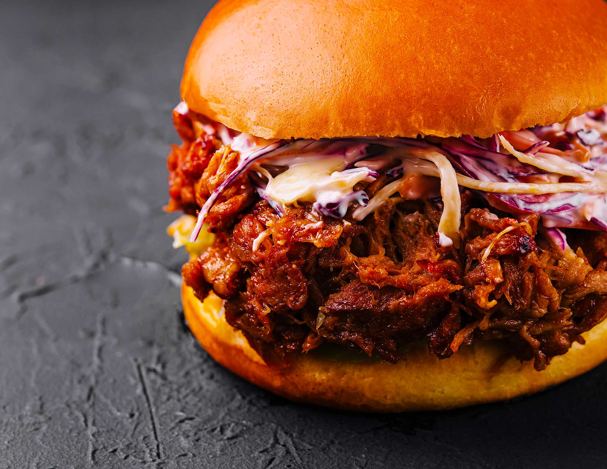 Pane al sesamo, pulled pork, cheddar, coleslaw, salsa bbq