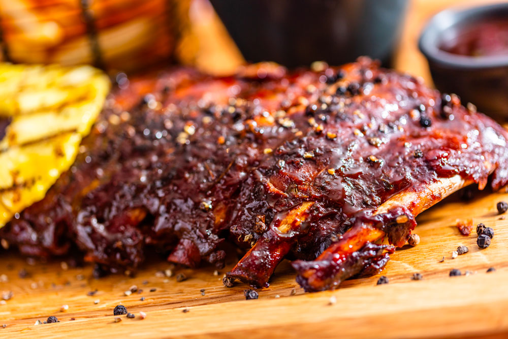 Costine di maiale marinate con salsa BBQ, cotte per 12 ore a bassa temperatura e finite in griglia, servite con patatine fritte
